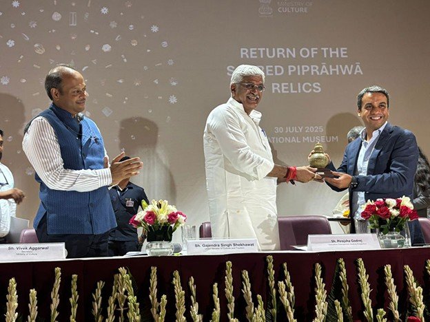 On 30 July 2025, the gem cases were ceremonially received at Palam Airport by Hon’ble Culture Minister Shri Gajendra Singh Shekhawat and myself. Buddhist monks chanted prayers, filling the air with spiritual resonance. The Hon’ble Prime Minister Narendra Modi called it “a joyous moment for India’s heritage, that would make every Indian proud.” Throughout this process Hon’ble Prime Minister Shri Narendra Modi and his office provided guidance and approval which resulted in historic repatriation under a PPP mode.